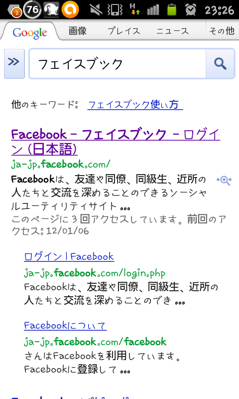 で、ブラウザ起動して、上の検索バーでフェイスブックて検索。ボートブラウザは起動してすぐにショートカットがあるのでそれをタップしてもいいです。