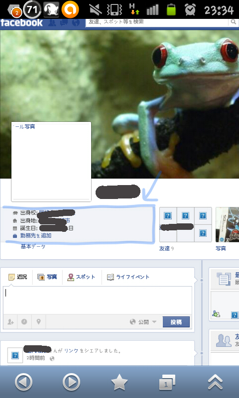 で、ブラウザでのフェイスブック利用なんですが、スマホ専用ページだとアプリと同じデザインで、プロフ変更ができないようになっています。